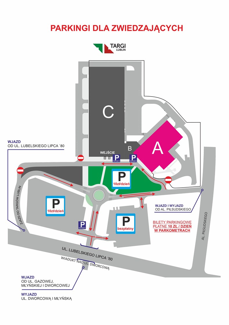 - Wjazd na teren Targów Lublin możliwy jest zarówno ul. Dworcowej, al. Piłsudskiego oraz zjazdem z wiaduktu od ul. Lubelskiego Lipca '80.